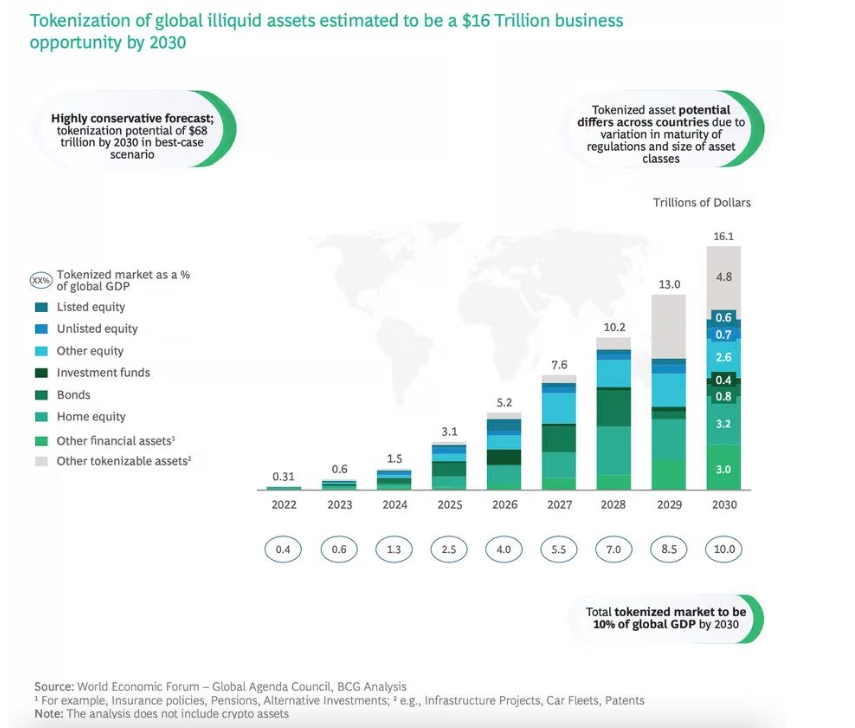全球范围内,我们都面临着各自国家的一些挑战。我们当然不希望食物和住房成为首要问题。AreteIQ正在引领提供几个供不应求行业的初学者、中级和高级培训,提供教育对于个人获得可接受的工资至关重要。我们不仅希望教育各自社区的个人,还希望雇佣他们。 现在,您应该能够看到在全球多个国家扩展额外的社区发展和成功中心的需求。每个新地点都带来了新的机会。GDPC代币,由AreteIQ提供支持,将在我们开展业务并雇佣代理的每个国家收购房产。众所周知,房地产通常会增值。 AreteIQ(代理的企业雇主)希望与ARETE代币持有者分享利润。ARETE代币将是一种“安全代币”,允许我们出售“链下资产”的分数份额。根据世界经济论坛的数据,到2030年,代币化市场总额将占全球GDP的10%。请参阅下面的图表。